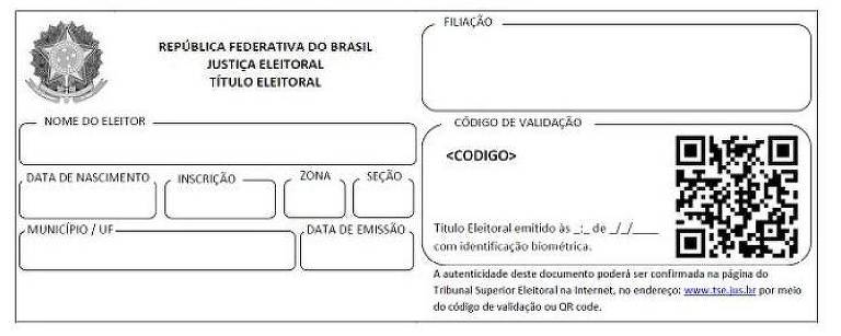 O Tribunal Superior Eleitoral determinou novo formato para o título de eleitor. O novo documento será impresso em papel comum (sulfite), informará a filiação (nome dos pais) e, em vez da assinatura do eleitor, utilizará o código de validação ou QR Code para verificação de autenticidade.