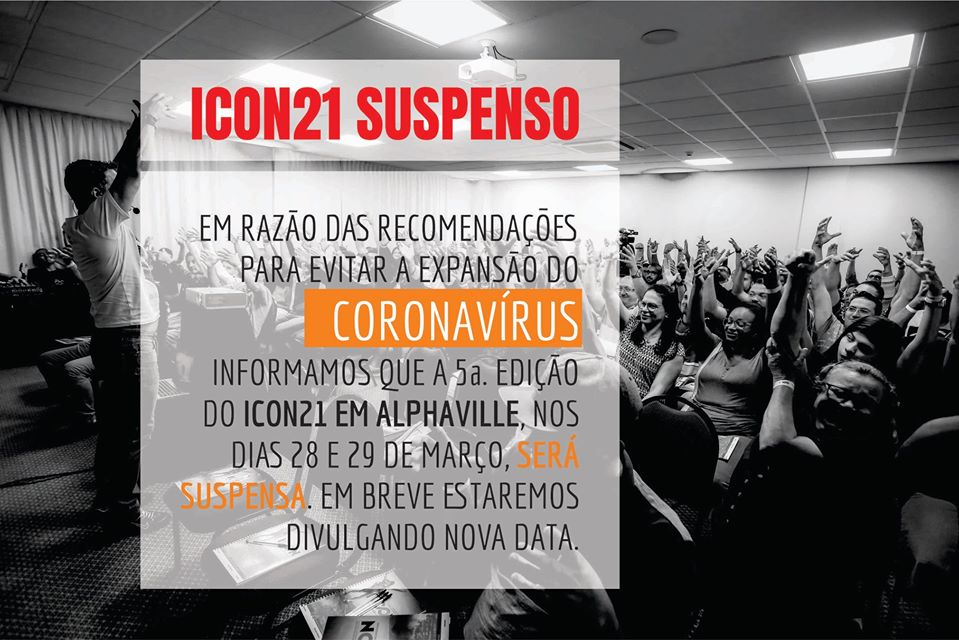 Em razão da pandemia de Coronovírus, a organização do maior evento de imersão para desenvolvimento pessoal estará suspendendo a 5a. edição do ICON21 em Alphaville, que aconteceria nos próximos dias 28 e 29 de março no Hotel Bourbon de Alphaville. A medida é tomada em razão das orientações do Governo para restringir a propagação do vírus. Como nosso evento tem a previsão de reunir dezenas de pessoas em local fechado e por 21 horas, entendemos que é adequado realizá-lo em outro momento, possivelmente no mês de maio de 2020.