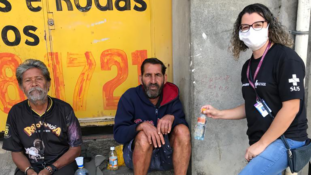 Seis profissionais compõem a equipe, que cobre cinco territórios no município e tem mantido os atendimentos e realizado visitas semanais a praças e calçadas onde essa população costuma ficar, conforme conta Caty.