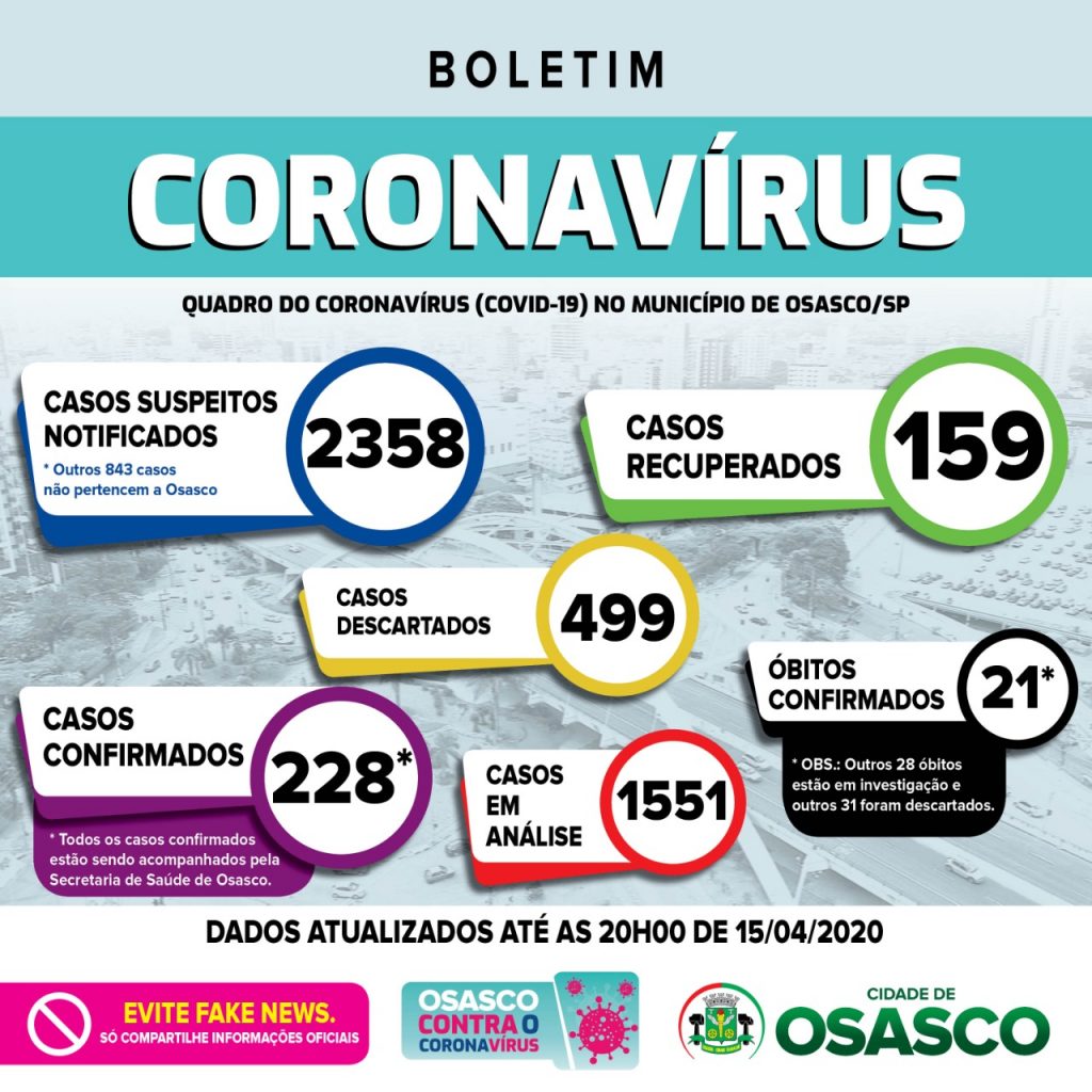 . Foram notificados 2358 casos. Outros 843 casos não pertencem a Osasco, são residentes de outros municípios.