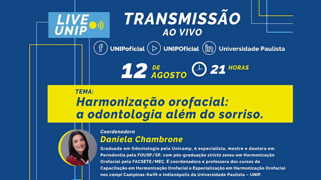 Já no dia 12, a live “Harmonização Orofacial: a Odontologia além do sorriso” será ministrada pela Profa. Dra. Daniela Chambrone, que é, entre outros, coordenadora dos cursos de Capacitação em Harmonização Orofacial e Especialização em Harmonização Orofacial na UNIP Campinas e Indianópolis.