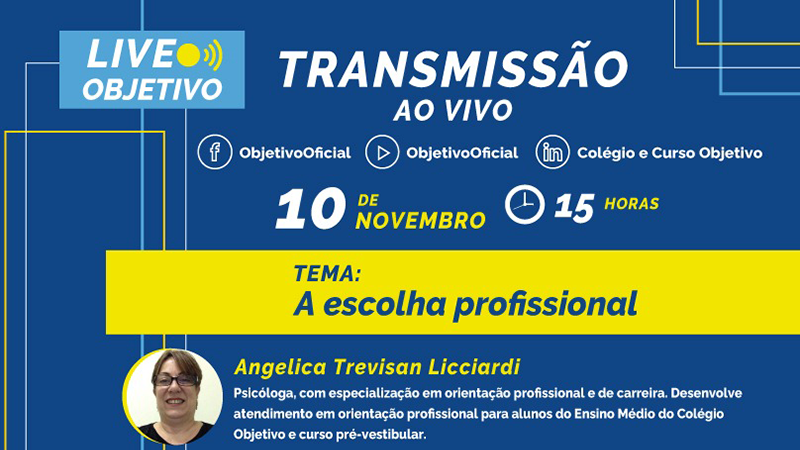 Mediada pela jornalista Sílvia Vinhas e comandada pela coordenadora Pedagógica Vera Lúcia da Costa Antunes e pela psicóloga Angelica Trevisan Licciardi – ambas do Objetivo –, a apresentação trará orientação para os estudantes e seus familiares nessa fase delicada, que é a da escolha da carreira. Assim, serão abordados: