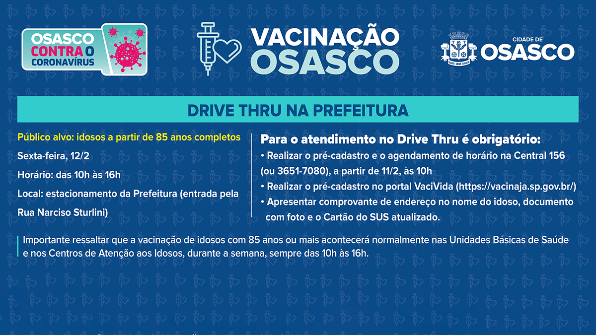 Osasco vai antecipar a vacinação contra a covid-19 de idosos com idade a partir de 85 anos completos para essa sexta-feira, 12/2, das 10h às 16h. Para reforçar a ação, foi montado um posto de drive thru no estacionamento da Prefeitura (entrada pela Rua Narciso Sturlini).