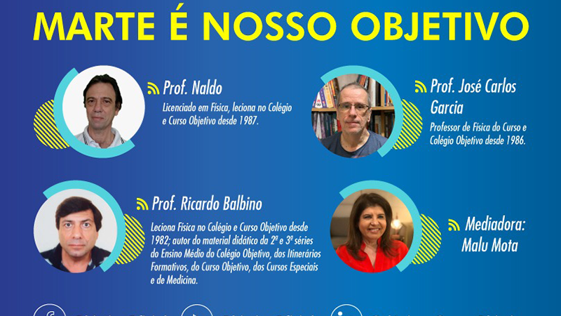 Apresentada pelas feras das aulas de Física do Curso e Colégio Objetivo, a live trará os professores Naldo, José Carlos Garcia e Ricardo Balbino que abordarão, entre muitos outros, os seguintes pontos: