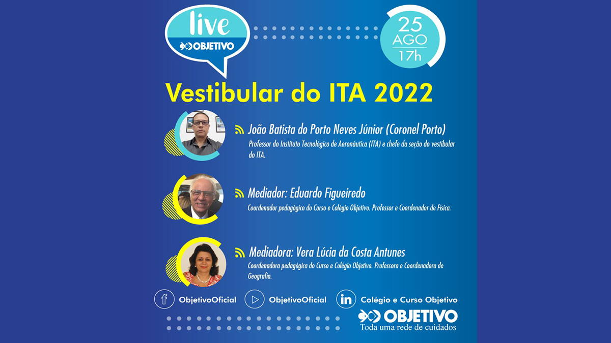 Quem pretende prestar o vestibular do Instituto Tecnológico da Aeronáutica (ITA) não pode perder a live “Vestibular do ITA 2022”, que o Objetivo transmitirá, em suas redes sociais oficiais, no dia 25 de agosto, às 17h.