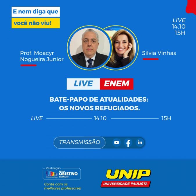 O assunto é tema de vestibular em Atualidades, razão pela qual as redes sociais da UNIP e do Objetivo transmitem, em 14 de outubro, às 15h, a live “Bate papo de atualidades: os novos refugiados”.