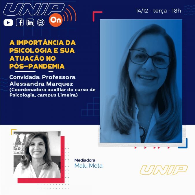 Para discorrer sobre o assunto, as redes sociais da UNIP exibem a palestra “A importância da Psicologia e sua atuação no pós-pandemia”, hoje, 14 de dezembro, às 18h. A atividade faz parte do projeto UNIP ON, que disponibiliza, em suas redes sociais, vídeos com palestras sobre inúmeros temas.