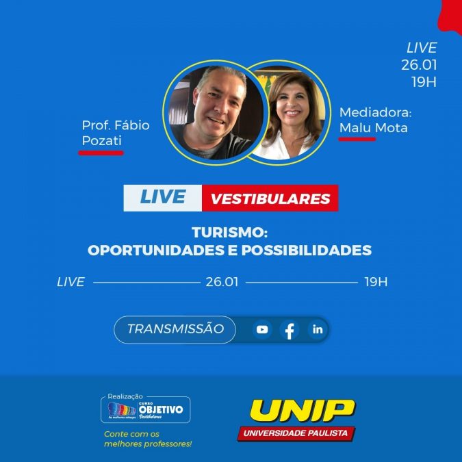 Esses e outros assuntos, de grande valor informativo para quem deseja seguir a carreira de Turismo, serão apresentados na live “Turismo: oportunidades e possibilidades”, no dia 26 de janeiro, às 19h, pelas redes sociais da UNIP e do Objetivo.