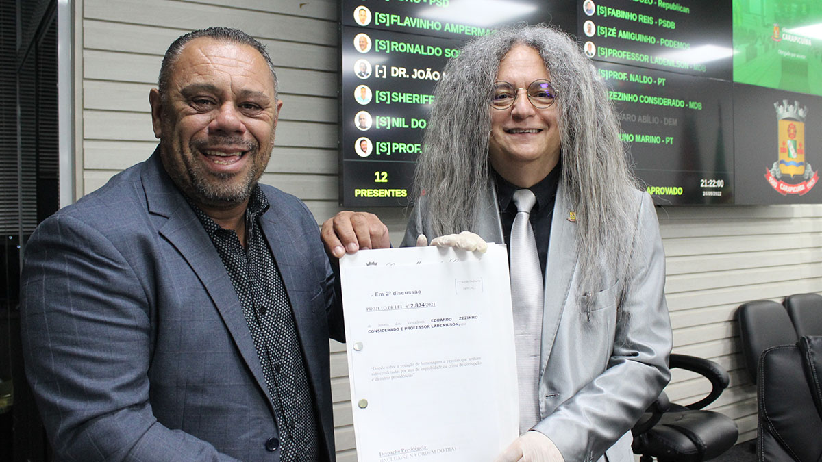 “Fica proibida, no âmbito da Administração Pública do Município de Carapicuíba, a concessão de homenagens a pessoas que tenham sido condenadas em última instância por atos de improbidade ou crime de corrupção”. Assim consta no Artigo 1° do Projeto de Lei n° 2.834/2021, aprovado essa semana na Câmara. O texto, de autoria dos vereadores Eduardo Zezinho (Considerado) e Professor Ladenilson, ambos do MDB, agora segue para sanção do prefeito Marcos Neves (PSDB).