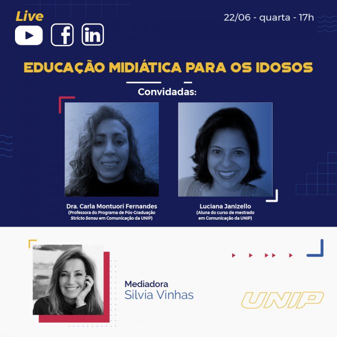 As respostas para essas e outras questões serão levadas na live “Educação Midiática para os idosos “, que será transmitida pelas redes sociais da UNIP no dia 22 de junho, às 17h.