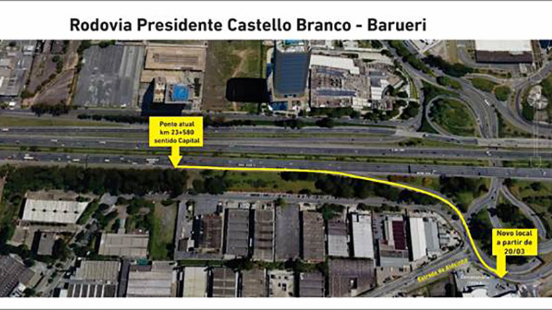 Para dar continuidade às obras de ampliação das pistas marginais da rodovia Castello Branco em Barueri, a CCR Viaoeste irá remanejar, a partir de 20/03, o ponto de ônibus presente no km 23+580 para a estrada da Aldeinha, em frente a concessionária Itatiaia, no trevo de Alphaville, em Barueri.