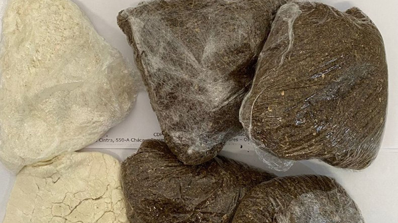 A primeira mulher apresentou imagem anormal na altura do tórax. Escondidos em seu top havia quatro invólucros com substância semelhante à maconha, pesando 342 gramas, e outros dois invólucros contendo um pó análogo à cocaína, com 107 gramas aproximadamente.