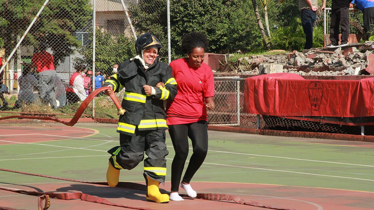 As meninas se dividiram em equipes e tiveram 10 minutos para cumprir cada exercício. Foram desafiadas a vestir o Equipamento de Proteção Individual (EPI) o mais rápido possível – fardamento que pode pesar até 20 kg. Simularam escaladas, ressuscitação cardiopulmonar, busca e resgate de pessoas que estão em escombros, ergueram bote salva-vidas, dentre outros treinamentos.