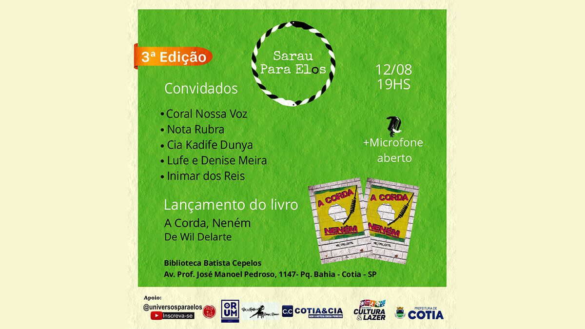 Está marcada para sábado (12 de agosto), a partir das 19h, a 3ª edição do ‘Sarau para Elos’ que acontece na Biblioteca Batista Cepelos. A programação terá a participação de artistas locais convidados e o lançamento do livro ‘A Corda, Neném’, escrito por Will Delarte. O evento é aberto ao público.