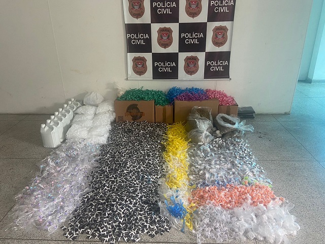 No total, foram confiscadas 28,2 mil porções de cocaína, mil de maconha, sendo uma parte misturada com uma substância conhecida como K2, 600 de skunk, 3 mil pedras de crack, além de 624 frascos de lança-perfume e os galões contendo o líquido da substância.