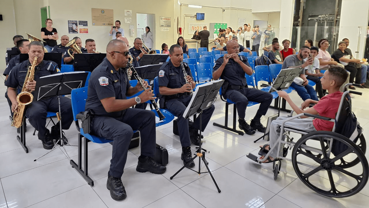 Nem bem começaram os primeiros acordes da primeira música tocada pela banda da Guarda Civil Municipal (GCM), sob a regência do CD (classe distinta) Rogério Felipe de Oliveira na tarde da última quarta-feira, dia 24, no saguão do Hospital Municipal de Barueri Francisco Moran (HMB) e várias pessoas já estavam filmando e compartilhando as imagens. “Esta música é ‘Hallellujah’ (de John Cale), tema do filme ‘Shrek’”, identificou logo Bruna Cachoeira, de 16 anos, que veio fazer um exame de sangue acompanhada da mãe Ivonete.