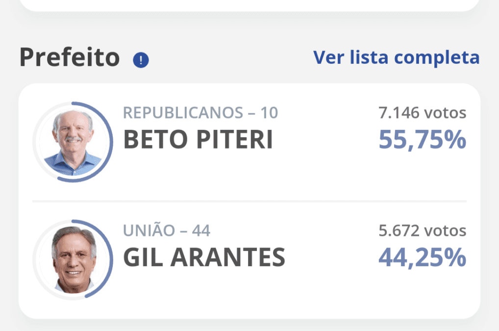 Com 7,39% das urnas apuradas, o candidato Beto Piteri, que conta com apoio do atual prefeito Rubens Furlan, contabiliza 55,75% dos votos válidos, contra 44,25% de Gil Arantes.
