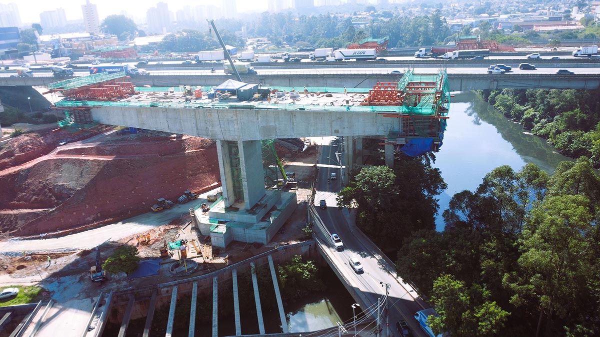 Destaca-se também o ritmo consistente das obras da nova ponte Guilherme de Almeida, com duas grandes etapas de concretagem por mês. Estão em curso ainda as fundações e estruturas de arte especiais, que envolvem a montagem de pilares e vigas com o auxílio de guindastes de grande porte, além das obras de contenção no km 26, fundamentais para estabilização do terreno e posterior implantação da Marginal Oeste e do Ramo Rotary A.