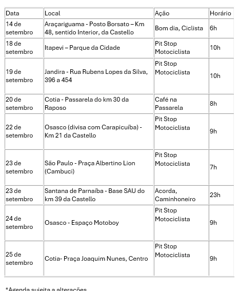 Serão seis ações voltadas a motociclistas. Em Itapevi e Jandira, o Pit Stop Motociclista começa às 10h nos dias 18 e 19, respectivamente. Em Osasco, no dia 22, a ação tem início às 9h e, em São Paulo, no dia 23, às 7h. Os dois últimos eventos, novamente em Osasco e em Cotia, acontecem dias 24 e 25, às 9h.