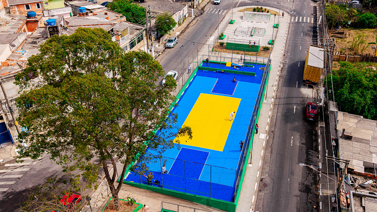 Além da quadra, foram executadas outras melhorias, como pintura geral, reparos na alvenaria e iluminação, e a instalação de um novo equipamento de playground.