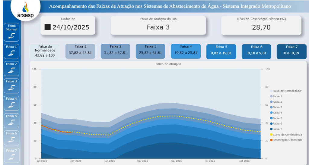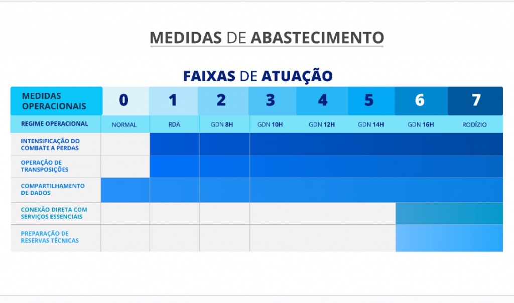 A faixa 3, onde São Paulo se encontra atualmente, prevê GDN de 10 horas por dia e intensificação de campanhas de conscientização. Já nas faixas 4, 5 e 6, os cenários são de contingência controlada, com períodos ampliados de redução da pressão na rede, por 12, 14 e 16 horas.