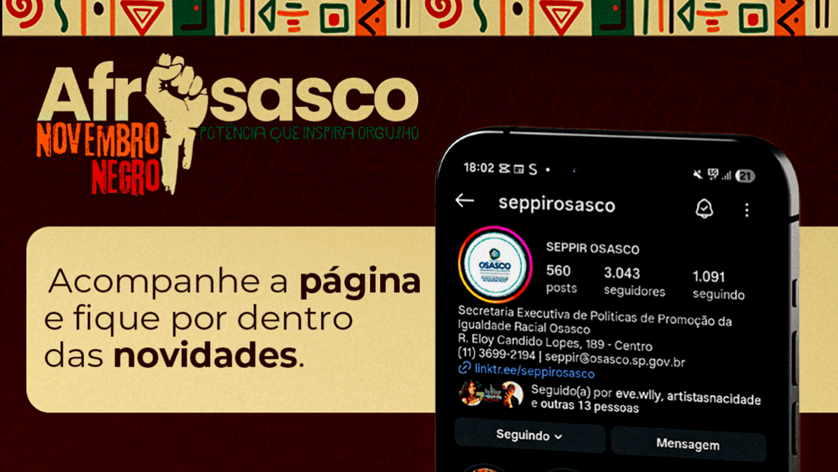 A Prefeitura de Osasco, por meio da Secretaria Executiva de Promoção da Igualdade Racial (SEPPIR), realiza ao longo do mês de novembro uma série de atividades culturais, educativas e de valorização da identidade afro-brasileira. O Novembro Negro é um momento de reflexão, ações de conscientização e resistência, e inclui diversas atividades gratuitas como rodas de conversa, oficinas, debates e apresentações culturais.
