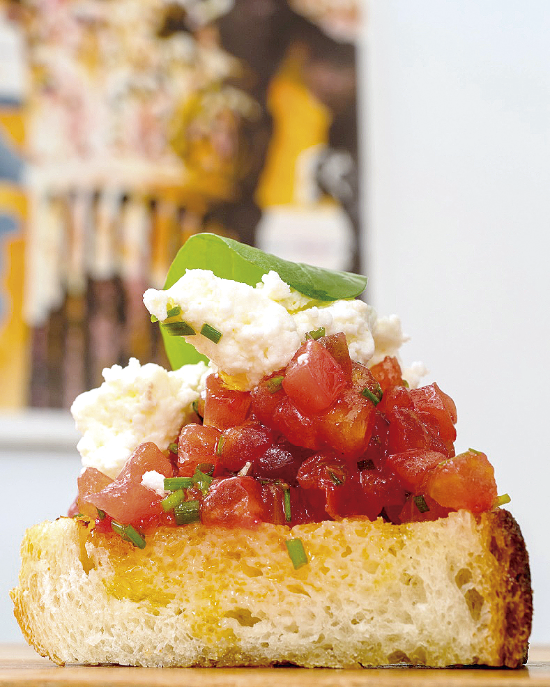 Tosta de tomate – temperada com manouri (ricota grega) e rúcula (R$ 38).