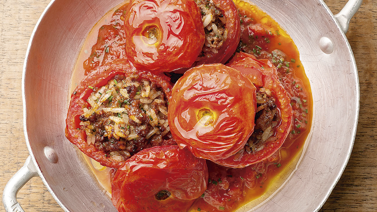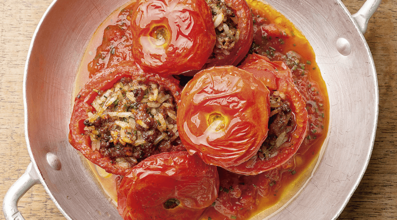 Gemista – tomate recheado com arroz, ragu de carne e especiarias (R$ 60).