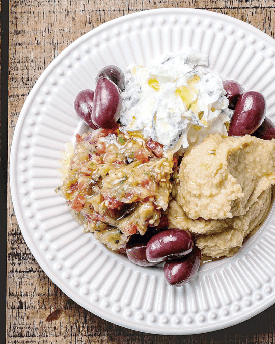 Mezzes – pão pita, favas (purê de grão de bico), Tzatziki (iogurte, pepino e alho), melitzanosalata (pasta de beringela, tomate e cebola roxa) e azeitonas Kalamatas (R$ 32).