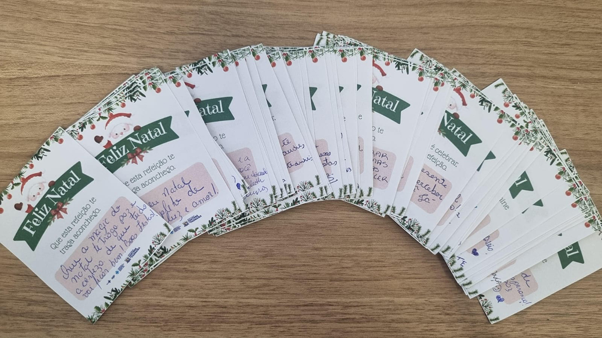 Nos dias 24 e 25 de dezembro, os pacientes internados receberam refeições acompanhadas de recados personalizados em celebração ao Natal. A ação, desenvolvida em parceria pelo Serviço de Experiência do Paciente e pelo Serviço de Nutrição da unidade, levou mensagens de afeto e esperança diretamente aos leitos. Na noite do dia 24, foram entregues bolinhos natalinos embalados com decoração temática, enquanto no dia 25 as refeições principais chegaram aos pacientes com mensagens escritas por colaboradores de diferentes setores da unidade, que participaram ativamente da iniciativa ao preencher cartões natalinos fixados nas embalagens.