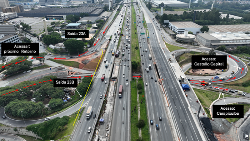 Desvio: Motoristas deverão utilizar a saída 23A, com acesso pela Alameda Rio Negro, permitindo retorno e conexão com a rodovia nos sentidos capital ou interior, na altura de Carapicuíba.