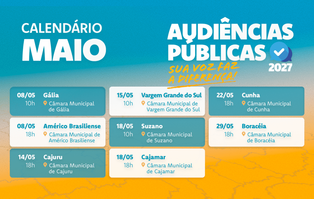 O ciclo terá início em Igarapava, no dia 9 de abril, e segue por municípios como Araçatuba, Peruíbe, Suzano, Cajamar e Cunha, até chegar à última audiência no interior, marcada para o dia 29 de maio, em Boraceia. Como de costume, o calendário será encerrado com uma audiência final na sede da Alesp, na capital, em data ainda a ser confirmada.